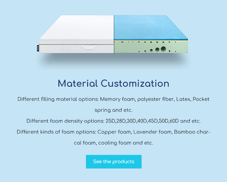 Different filling material options: Memory foam, polyester fiber, Latex, Pocket spring and etc. Different foam density options: 25D,28D,30D,40D,45D,50D,60D and etc. Different kinds of foam options: Copper foam, Lavender foam, Bamboo charcal foam, cooling foam and etc.